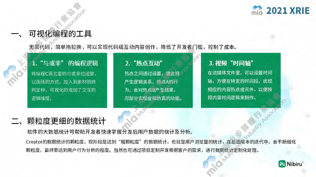 NibiruCreator的主要特点,第一个是无需编程,通过简单的拖拉拽就可以生成交互式的内容,这一点非常重要,目前我们的行业合作伙伴也大多看重了这一点。当然了,在整个对交互性的设计上来讲,我们针对不同的场景需求,还是有很多单独的一些功能在里面的。