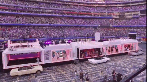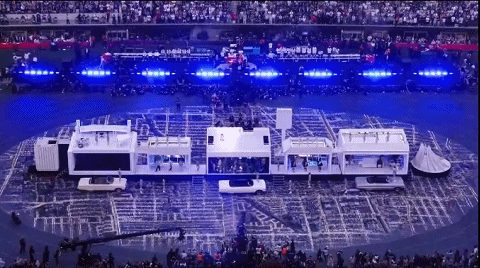 中场秀表演在五个相互连接的舞台上进行。舞台演出区域被设计成一栋拔地而起的白房子,演员一会儿在屋顶表演,一会儿又回到了房间。房子前停着经典的敞篷车,好像大家驱车回到了家。这样的布景设计很符合“邻里”的设计理念,温馨、亲密、有安全感和距离感。