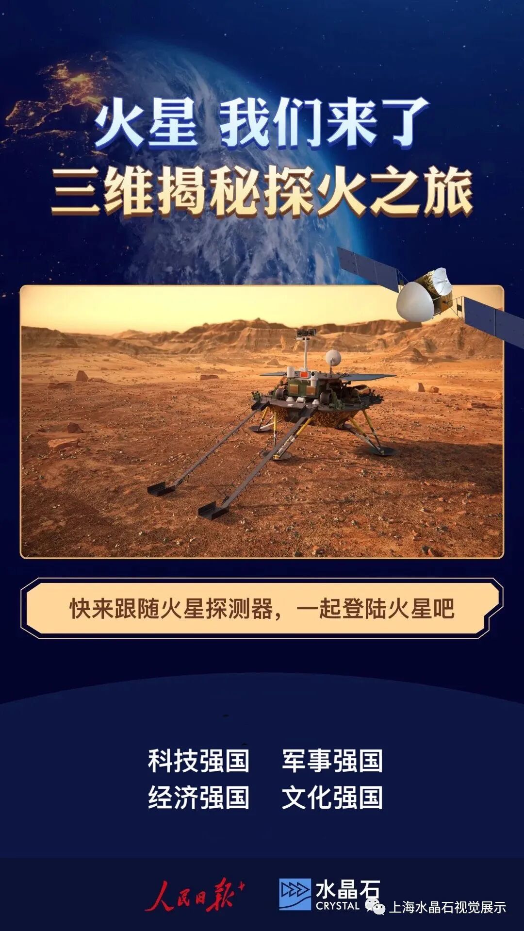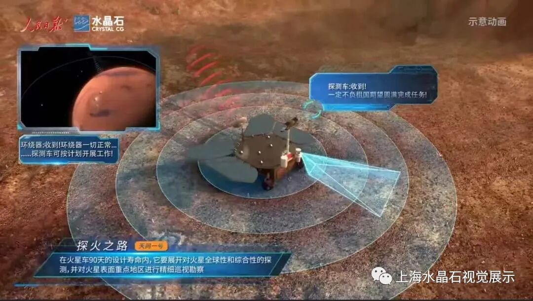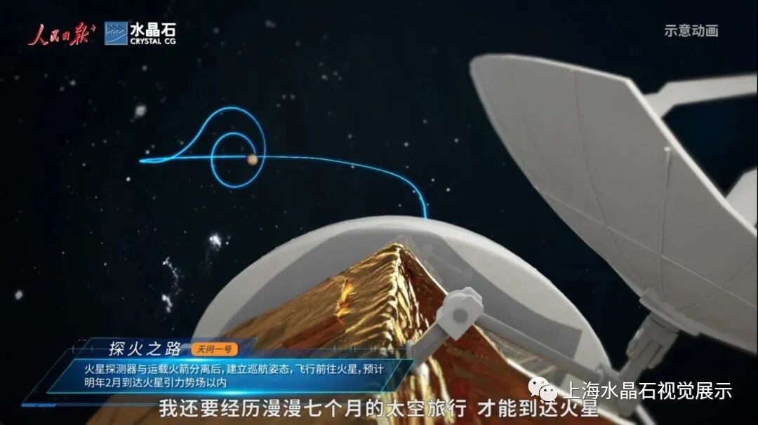 暨此特别时刻,水晶石集团与人民日报新媒体联合出品了三维演示动画。从发射升空、地火转移轨道,到火星环绕、着陆以及巡视探测等方面的科普知识极其生动、形象地展现出“探火之旅”。