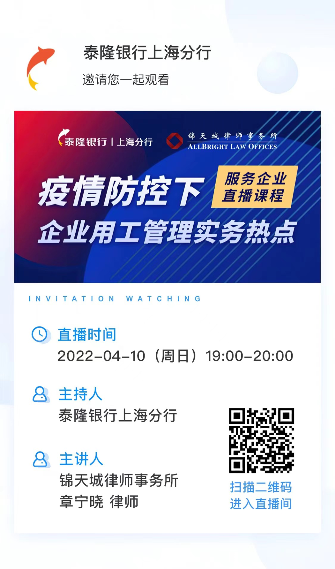 4月10日晚上,泰隆银行上海分行携手上海市多媒体行业协会、上海市锦天城律师事务所章宁晓律师带来《疫情防控下--企业用工管理实物热点》直播分享。