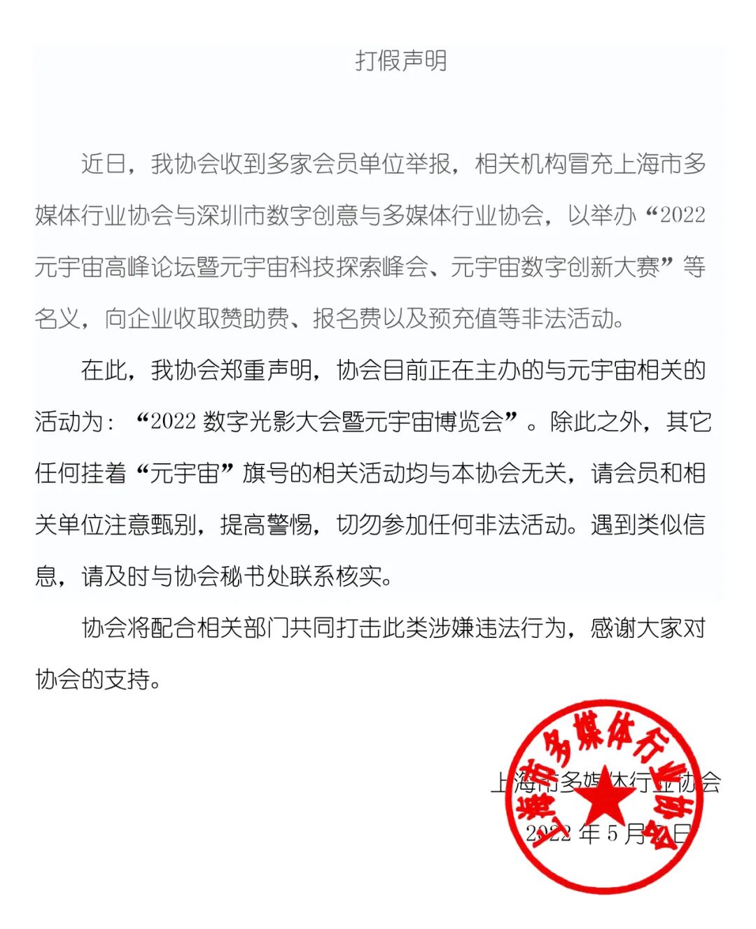 近日,我协会收到多家会员单位举报,相关机构冒充上海市多媒体行业协会与深圳市数字创意与多媒体行业协会,以举办“2022元宇宙高峰论坛暨元宇宙科技探索峰会、元宇宙数字创新大赛”等名义,向企业收取赞助费、报名费以及预充值等非法活动。