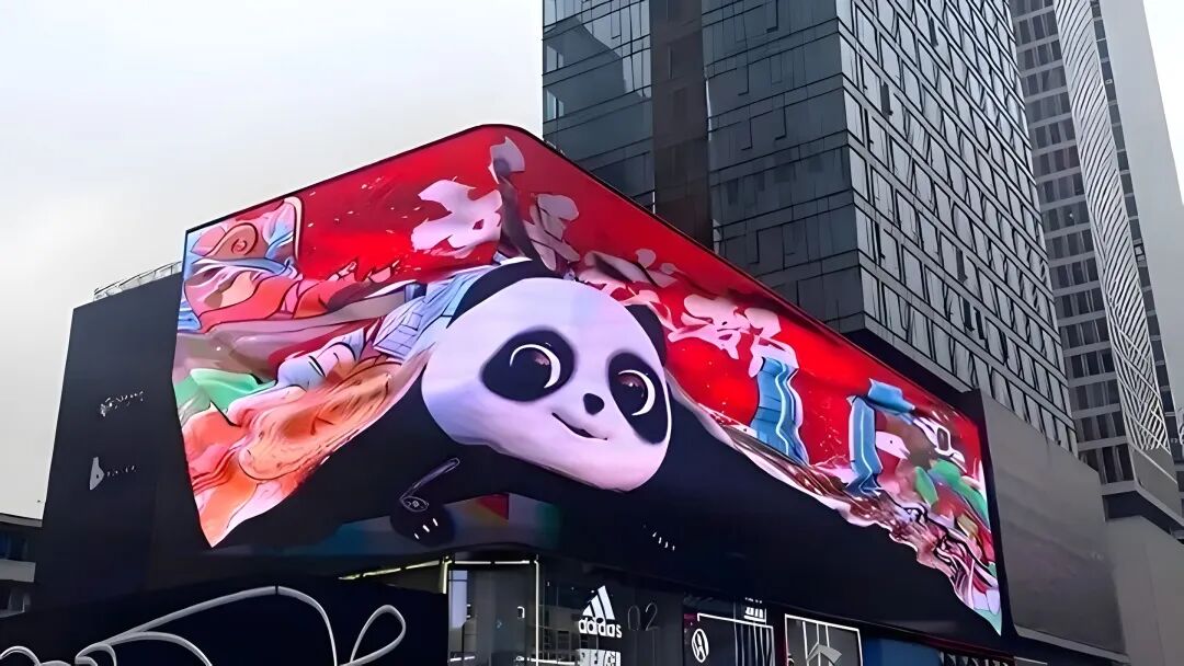 裸眼3D在户外的使用,通常会采用P6-P8的LED为硬件设备,并将其构造成外凸的L形折角,其中所呈现的定制视频内容,亦是经过了特殊的技术处理,通过上下檐口的黑边素材以及L形折角所带来的左右眼视觉偏差,实现裸眼3D的视觉效果,为此正对直角边的位置是户外裸眼3D的优选观看视角。