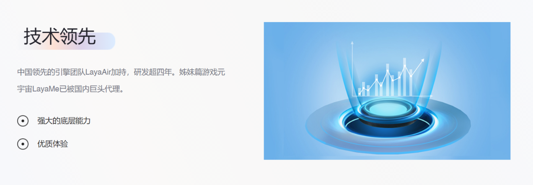 旗下游戏引擎LayaAir,中国最大的原创HTML5 3D游戏引擎。3D-WEB市场份额超90%,专业开发者用户超100万,服务了华为、阿里巴巴、腾讯、字节跳动、百度、京东、网易、高通、小米、OPPO、vivo等众多知名客户。