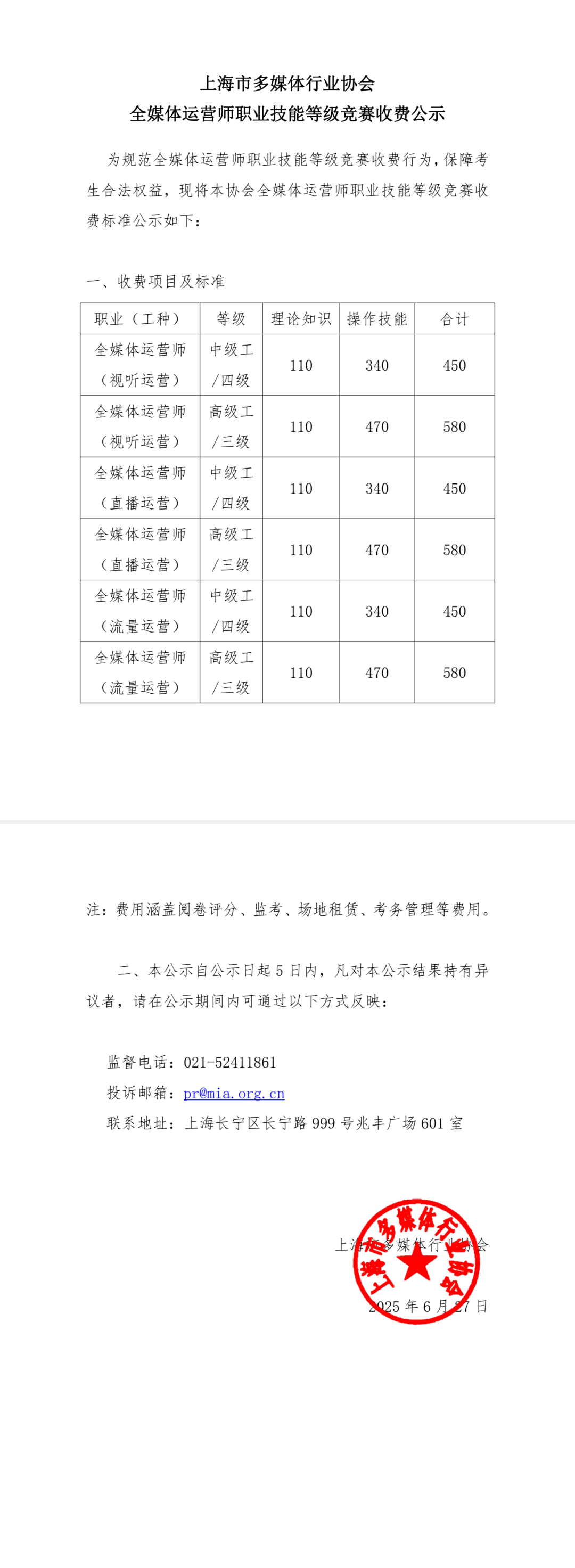 为进一步规范全媒体运营师职业技能等级竞赛的收费行为,切实保障广大考生的合法权益,上海市多媒体行业协会现正式发布全媒体运营师职业技能等级竞赛的收费标准公示。本次公示详细列出了不同等级、不同方向(视听运营、直播运营、流量运营)的全媒体运营师职业技能等级竞赛的收费项目及标准,包括理论知识与操作技能两部分的费用合计。我们承诺,所收取的费用将全部用于阅卷评分、监考、场地租赁及考务管理等必要环节,确保竞赛的公平、公正与顺利进行。